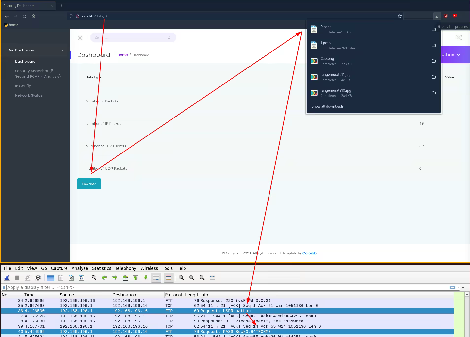 going to http://cap.htb/0/ we find the 0.pcap which contains packet information regarding the nathan user's password Buck3tH4TF0RM3!. So let's try to login via SSH with his credentials: