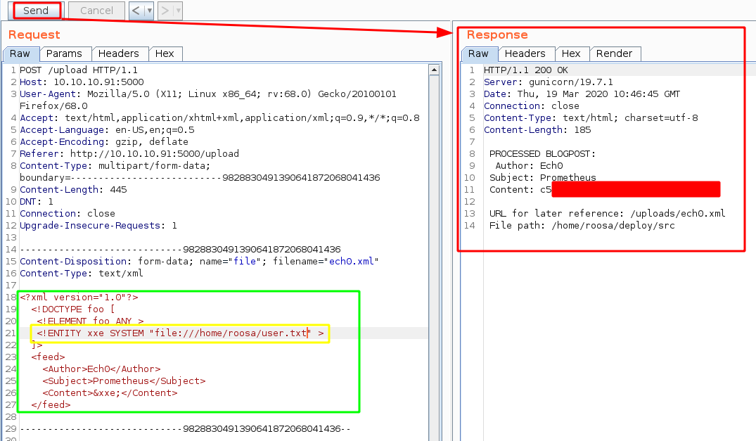 What we just did was creating an infected xml file, uploaded it, and intercepted the request with burpsuite, so that we can send it to the repeater (CTRL+R) and then modify it and send it repeatedly: