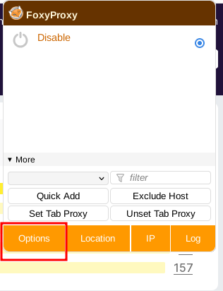 First, find FoxyProxy in the menu bar and choose "options".