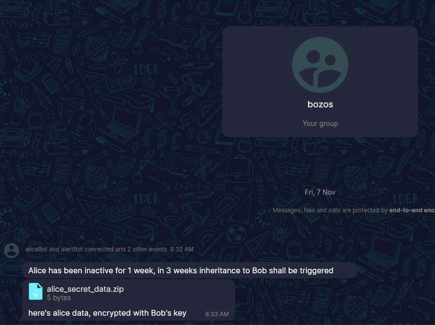 inheritance_message: "Alice has been inactive for three weeks, here is the inheritance data she prepared. Godspeed to her."