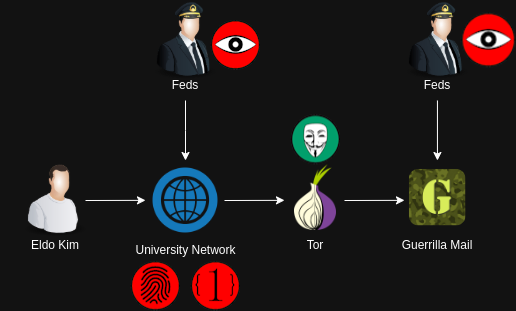 Guerrilla Mail was a site that allowed a person to send emails without the need for an account, which made it possible to send emails anonymously since everyone could send emails from the same address and needed nothing to sign up. However, when an email was sent, Guerrilla Mail also included the IP address of the sender in the email (probably to have a way of addressing abuse). Eldo Kim seemed to know this, though, and used the Tor browser when sending the emails. This meant that the authorities, upon examining the emails, could only see a Tor exit node. Consequently, they investigated who on the university network was accessing the Tor network and found only one individual: Eldo Kim.