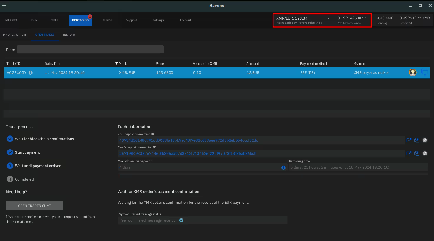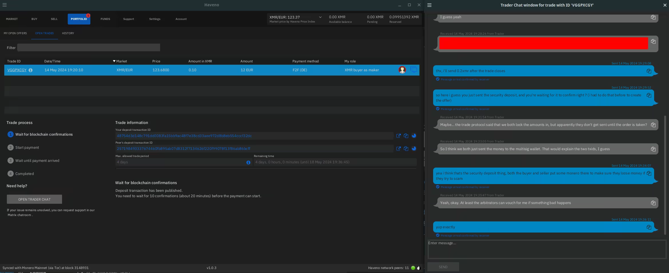 Once the security deposit has been validated by the network for the other party, you will get a notification that the trade can begin: