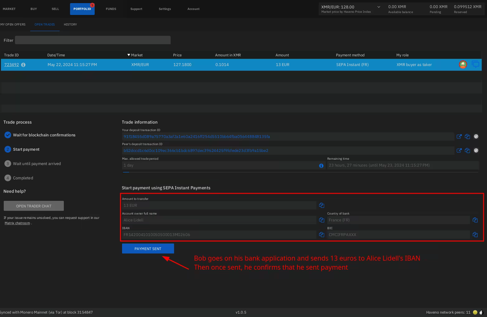 Next, Bob has to pay 13 Euros to the Alice, via a bank transfer (SEPA instant) as he can now see her bank information: