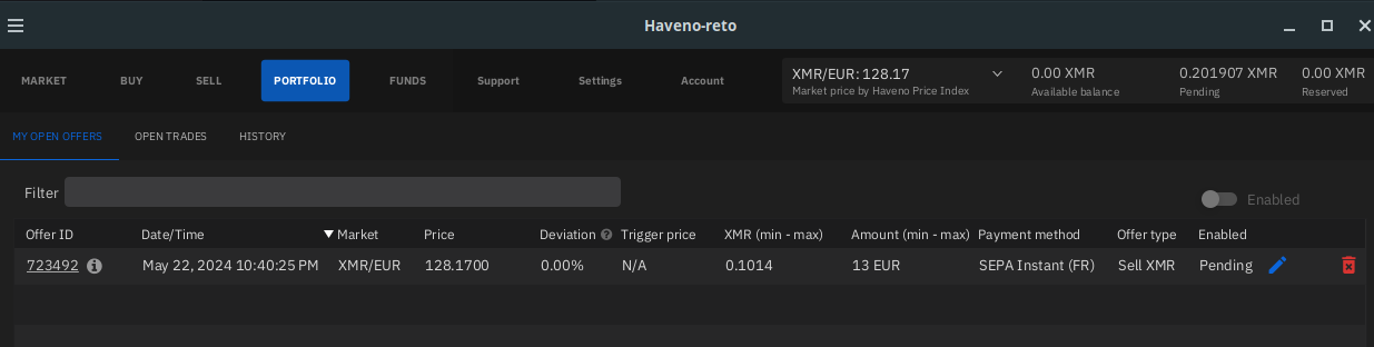 Alice uses her monero wallet to fund the offer, and then it shows as pending on her Haveno DEX as Pending: