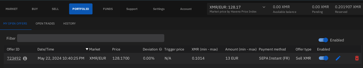 Haveno DEX Bank Transfer (ex: SEPA) -> XMR transaction
