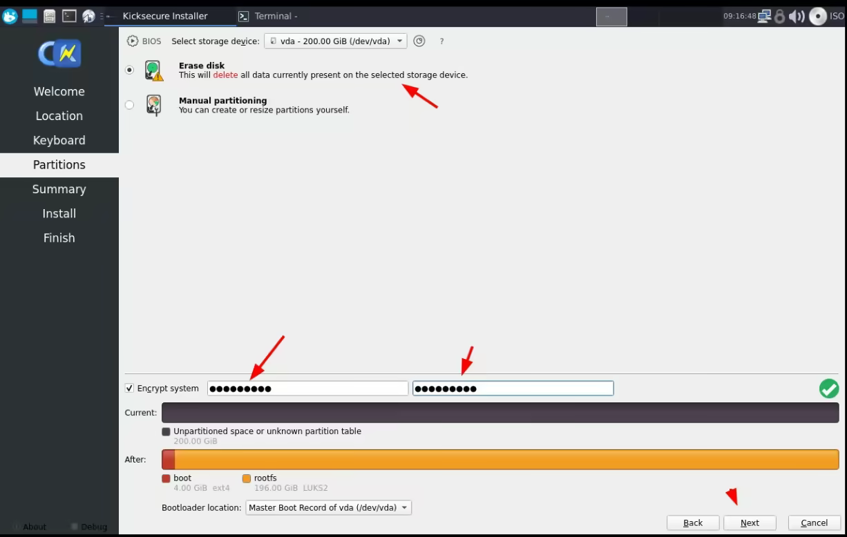 Once here, we reboot the VM, and upon rebooting we unlock the encrypted system drive: