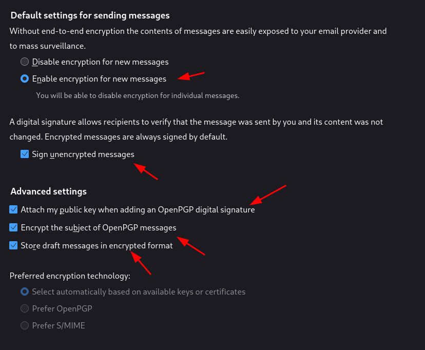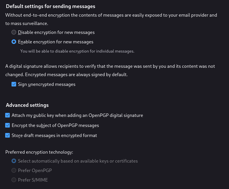 So from here you can copy your public key and paste it wherever you want, for example on your website, so that the users who want to message you will be able to encrypt their messages. Also add the following settings in thunderbird to automatically encrypt messages you wish to send out:
