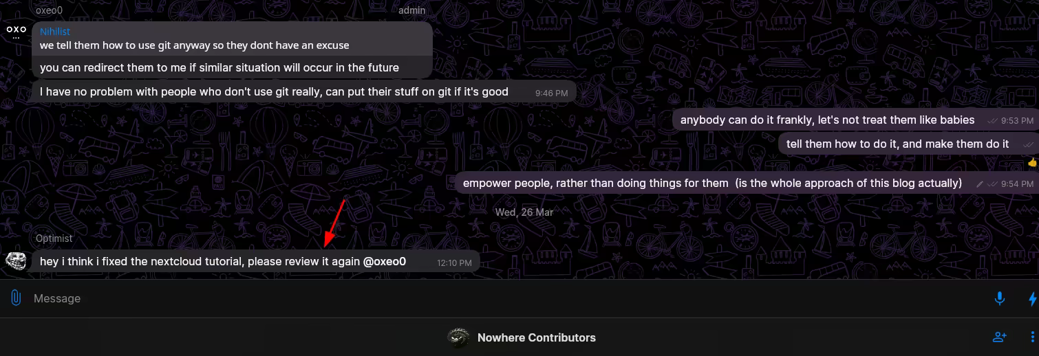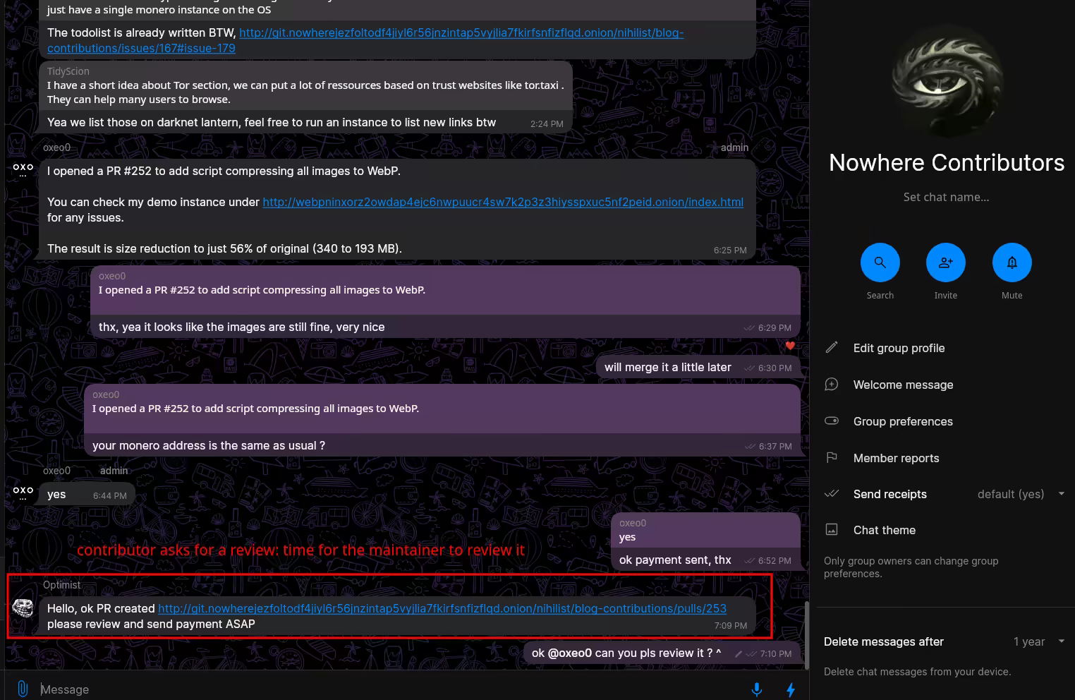 Here for example, the contributor "optimist" submits a contribution after having followed the "how to contribute" guide, and lets you know in the contributors chatroom: