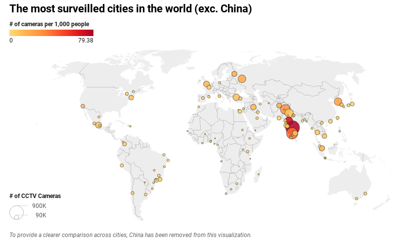 As you can see, China is excluded from this map, and there's a simple reason for that. With a population of 1.42 billion, the current estimate of 700 million cameras means there are 494.25 cameras for every 1,000 people in China. That's nearly one camera for every two people. If China were included on this map, other cities would barely register.