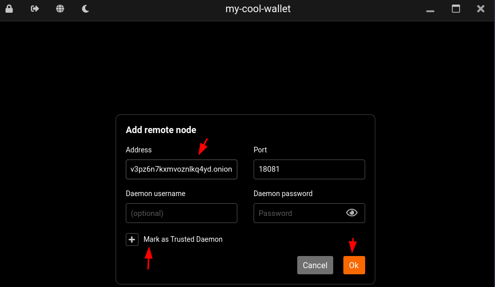 Now with this setup we can use .onion monero nodes as follows (either pick one you trust from https://monero.fail/ for example my .onion monero node at this URL: http://nowherejezfoltodf4jiyl6r56jnzintap5vyjlia7fkirfsnfizflqd.onion:18081 or more preferably (as Chainalysis is running an unknown amount of malicious nodes), host your own monero node as explained in this tutorial.