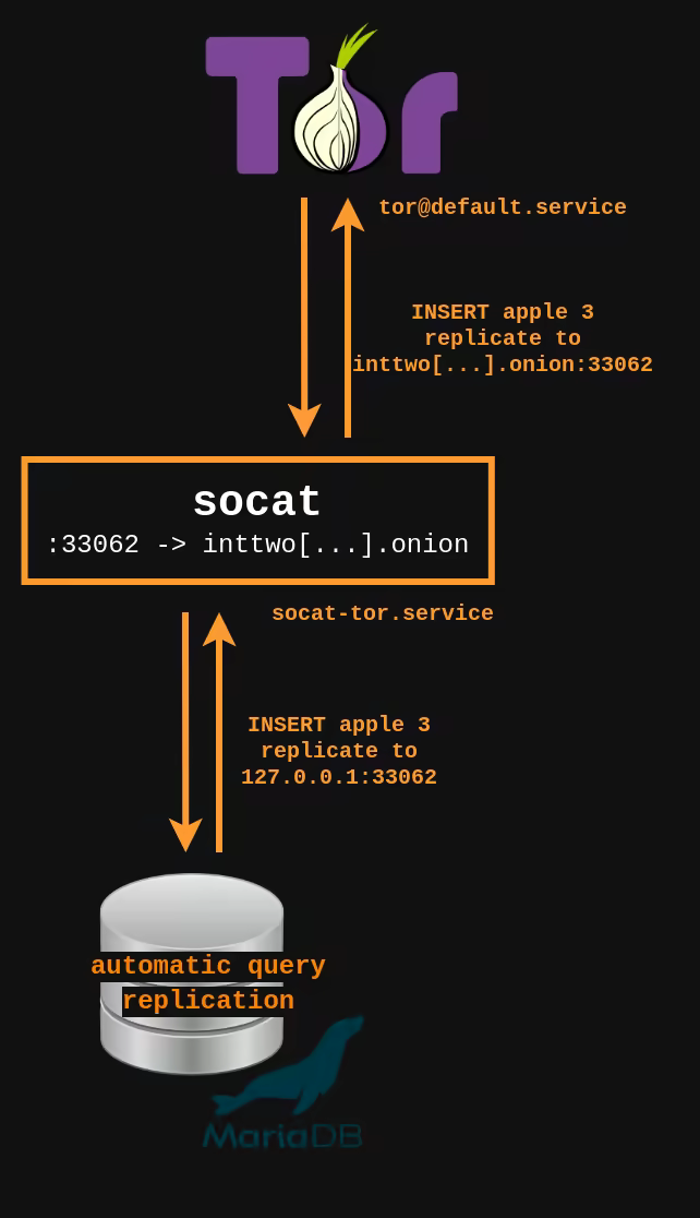 The MariaDB server running on each machine will connect to an onion address using socat as a background service configured with systemd, since it cannot utilize the socks5 proxy provided by the Tor client directly.