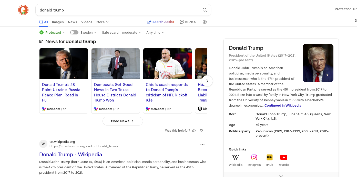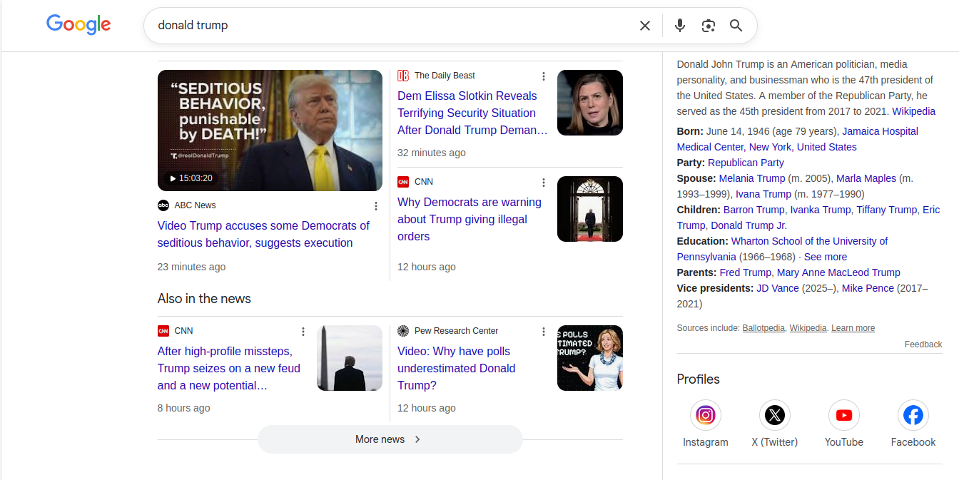 As an example, I searched "Donald Trump" on both Google and DuckDuckGo to compare the first results on each search engine. The results were quite revealing: