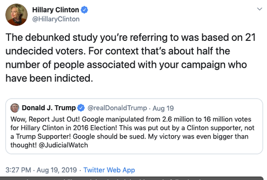 What is particularly relevant here is that Hillary Clinton publicly stated on Twitter that Epstein's research was false and had been debunked, after Donald Trump referenced and supported his studies. Following this public dispute, Epstein claims that Google, widely regarded as a significant supporter of Clinton's 2016 presidential campaign, restricted his access to platforms and removed his content without warning. Epstein interprets these actions as a direct response to his research and public visibility, which seems to be the only possible interpretation.