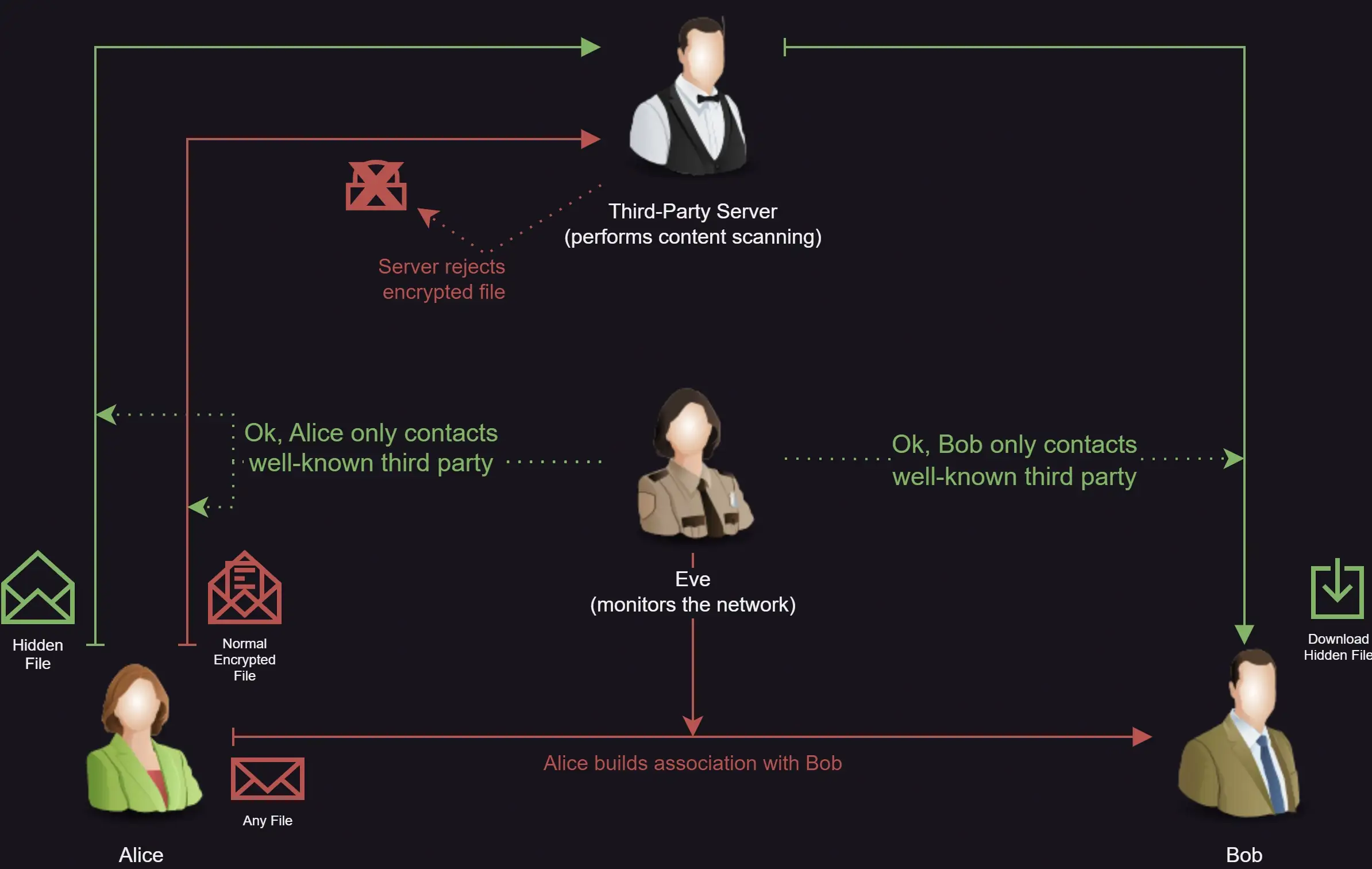 When relying on such third parties, steganography can help circumventing censors. If an adversary controls a critical link in the network and blocks all communications they can't inspect, you need to conceal your encrypted communications inside of superficially innocuous traffic. An example of this would be a corporate email server which denies all attachments it can not scan for malware.