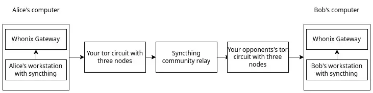 Syncthing has its own relays for supporting transmission of files between peers which are both behind the nat, and it works when both parties are behind tor. This allows us to guarantee the anonymity of both parties.