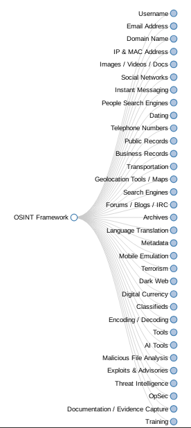 OSINT Framework is a website designed to help you find all the resources needed for OSINT investigations. It is structured as a simple tree, where each category leads to subcategories and ultimately to specific tools. For example, if you want to extract metadata from a photo, you would first select the "Images / Videos / Docs" section in the tree.