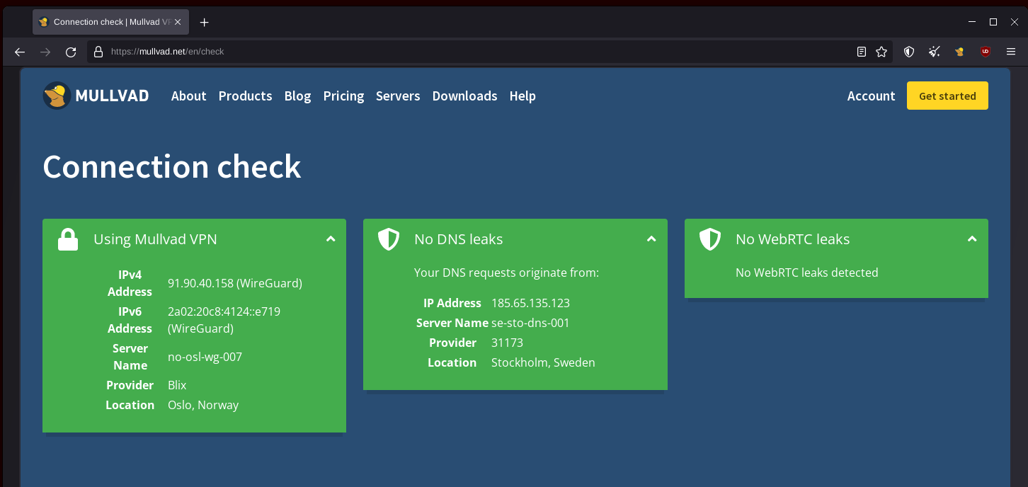 And then once applied, you can check if it works as intended from inside the VM (all that's required is for the VM to have a NAT connection), by going to https://mullvad.net/en/check from inside the VM: