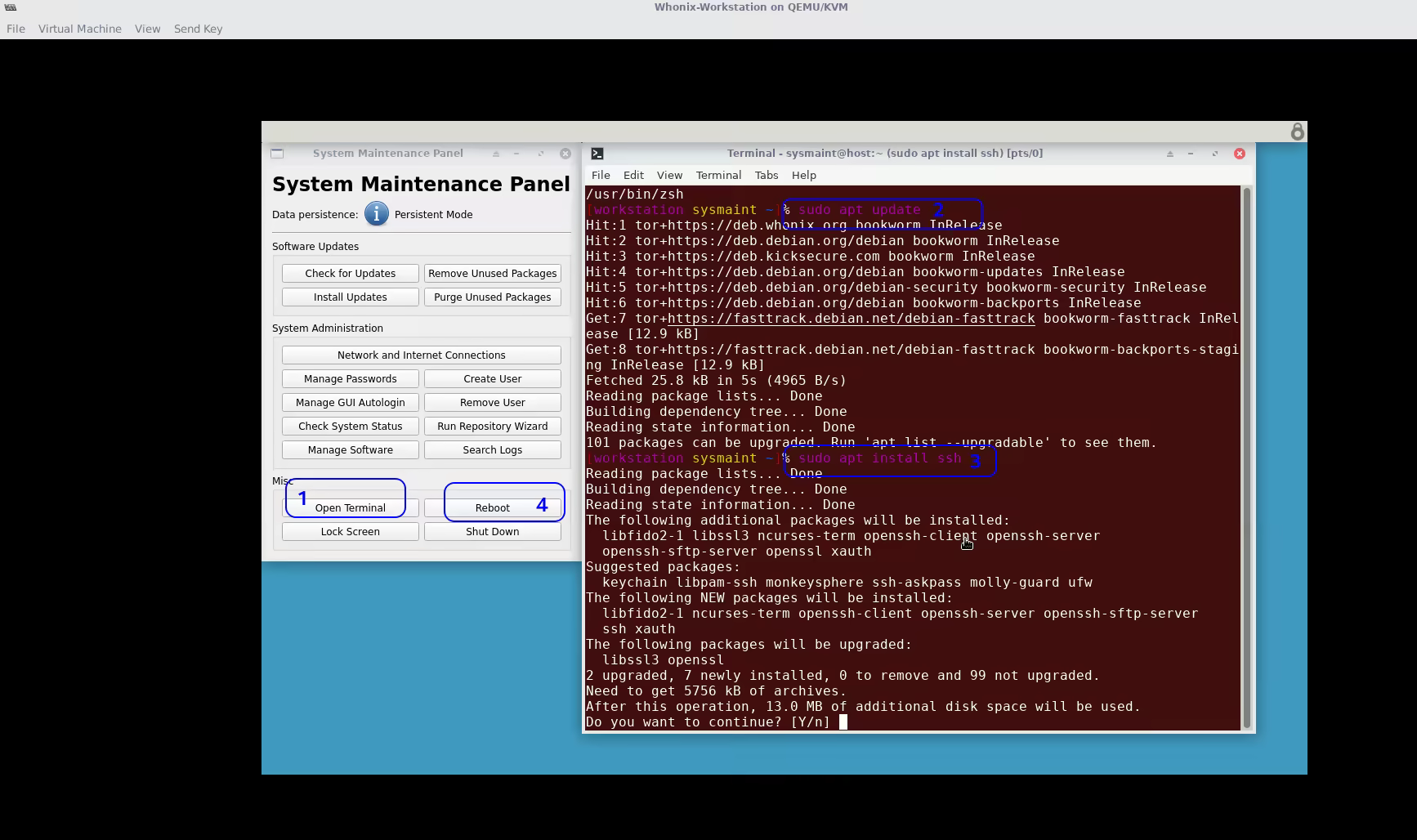 Before we continue to the next part we need to install the ssh package on our Whonix VM. We do this by rebooting the VM, booting into SysMaint mode, Opening the terminal, and installing with our package manager: